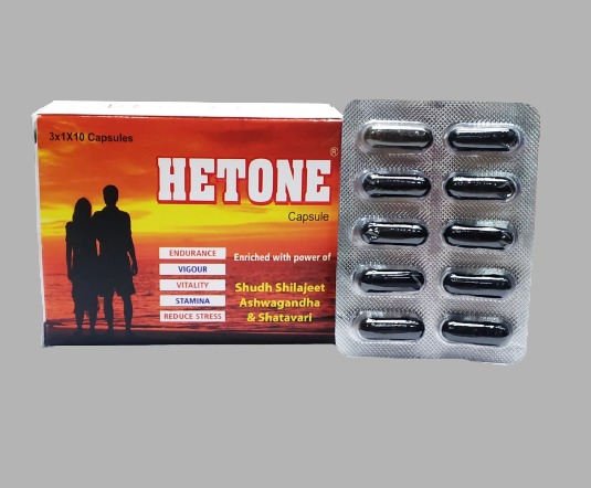 | HETONE CAPSULE | Each 500mg hard gelatin capsule Atmagupta (Mucuna prurita) 100 mg Goksura (Tribulus terrestris) 25 mg Guduchi (Tinospora cordifolia) 50 mg Ashwagandha (Withania somnifera) 100 mg Amla (Emblica off icinalis) 20 mg Vidarikanda (Pueraria tuberosa) 50 mg Kokilaksa (Asteracantha longifolia) 40 mg Shatavari (Asparagus racemosus) 25 mg Shudh shilajeet 50 mg Akalkara (Anacyclus pyrethrum) 40 mg | ![]() | |